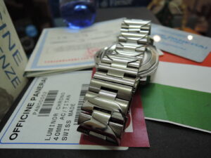 ボンジョルノ~陽気なイタリアから✨✨PANERAI ファースト”1st”クロノ💗🌎世界限定500本💛入荷しました❕💗💛✨✨しかも中身は❓あのゼニス社の”エルプリ”様ムーブメント搭載なんです❕💗💛✨✨「へー最初ってべゼルって・”刻みが無い”・ピカ✨ピカ✨表面な✨刻み無しポリッシュべゼル ✨なんだぁ~❕💗💛」✨✨B品番 1999年製 ・PANERAIの・本場イタリア経由・大人気・完品美品・モデル❕💗💛💗💛✨✨希少500本限定!✨✨40mmケース チタンTi×ステンレスSSコンビ✨✨ PANERAI史上1stファースト”クロノ”グラフモデル!✨✨ルミノールクロノ ✨✨刻み無しポリッシュべゼル ✨✨自動巻名機”エルプリメロ初搭載”モデル ✨✨裏スケルトン✨✨ 観音開きバックルコンビ純正ブレス(内径MAX19.5cm位) ✨✨ルミノバ夜光 ✨✨200M防水✨✨ 当店にてOHメンテナンス済!✨✨希少40mmクロノモデル入荷❕💗💛