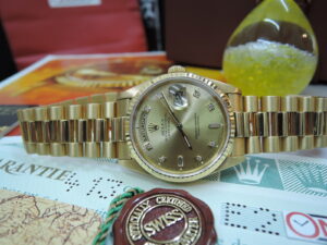 👑✨ROLEXの最高峰✨・男なら・一生に一度は・手にしたい❕💗💛・この圧倒的な存在感❕💗💛・・⌚・・✨18KYG無垢製✨・・『Ref18238A💎・E品番・1989年~1990年製』✨💗・(o^―^o)ニコ・『韓国』・から・初期E品番・で・A💎ダイヤ”金”文字盤✨・36mm・DAY–DATE様✨❕💛💗✨”金”無垢MAX!💛✨『💗年内最後の💛3連休💛に✨お買い¥得価格✨な・”金”文字盤✨A💎ダイヤ✨&✨”金”文字盤・Tトリチウム夜光✨ピカピカ✨ほぼ傷無し✨Ref18238A💎✨・は・如何ですか❓Prプレジデントブレス(22コマ・O刻印・1990年製)💛💗💛💗✨アンニョンハセヨ・な・韓国経由❣・✨当時の赤タグ付き❣💛💗💛💗・”完品”❕❣・・・魅惑の✨”DAY–DATE”✨入りました❕💛💗💛💗”一目ぼれ”間違い無し❕❣・・生産終了品 初期型”E”品番・1989年~1990年製!✨18KYG無垢製✨ ROLEXブランド最高峰『デイデイト』💛💗💛💗36mmケース 誰もが”一度”は手にしたい!!デイデイト ”・✨金シャンパンA💎ダイヤ✨文字盤&Tトリチウム夜光❕❕ 100M防水 自動巻! サファイヤクリスタル風防(👑王冠透かし無し)❕ ギザギザ・フルーテッドべゼル!✨👑王冠竜頭✨❕❕当時の豪華茶革製ROLEX黄金バックル付純正BOX(内)!程度もご安心ください!✨✨完品&美品✨✨・・ROLEX国番号・413・韓国・経由入荷❕❣・・・( ^ω^)・・・ただいまONOMAXでは『1回払い~24回払いまで・”無金利”(他~60回も有りMAX)・ショッピングローンが絶好調❕❕』