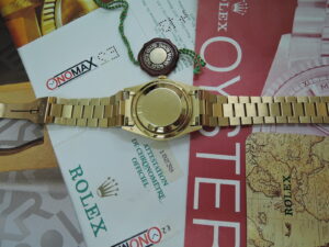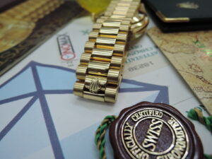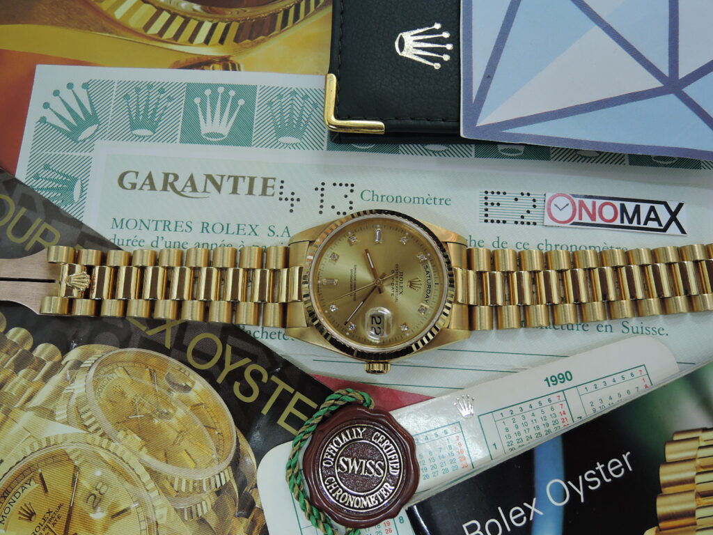 ✨✨付属品✨✨✨生産終了品 ✨18KYG無垢製✨ 当時のROLEX純正豪華純正大型BOX(内・革製王冠バックル付・)&保証書(紙製・パンチ抜き・国番号413・韓国・)✨初期E品番(1989年~1990年)✨35年物✨当店にてOHメンテ済み❕✨眩しい輝き✨ギザギザフルーテッド金べゼル❣・✨金色シャンパン・A💎ダイヤ文字盤✨Tトリチウム夜光✨❕✨ 日付デイト&曜日表記 ✨👑王冠竜頭✨ 自動巻 36mm 100M防水 ✨サファイヤクリスタル風防(👑王冠透かし無し)❕✨伸び感有りPrプレジデントブレス(・22コマ・O刻印・~1990年製)💛 ✨当時の小冊子×1冊(YOUR ROLEX)❣❕✨当時の赤タグ付き❣💛・パスポートサイズ保証書入れ・・ROLEXカレンダーカード(1989・1990)❕✨ノンポリ❓みたいに✨✨バキバキ&キレキレ状態・完品&美品✨金✨A💎ダイヤ”モデル・・・ROLEX国番号・413・韓国・経由入荷❕❣