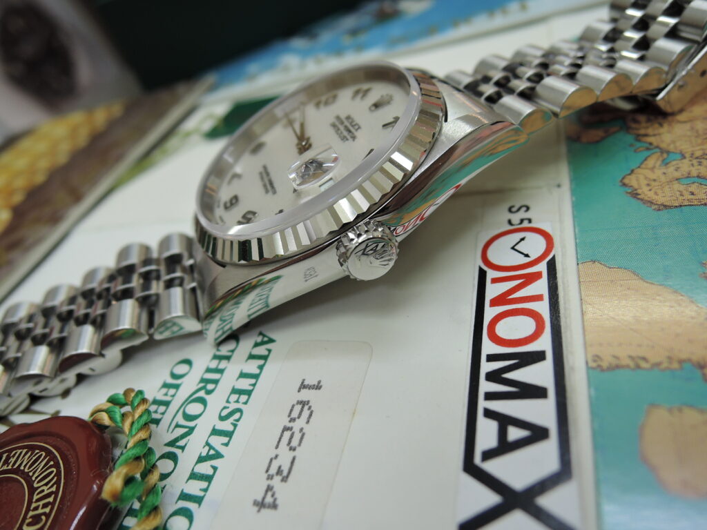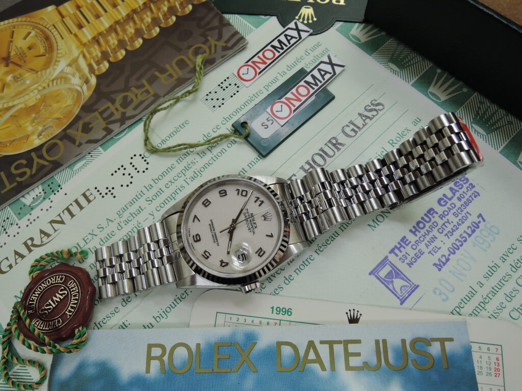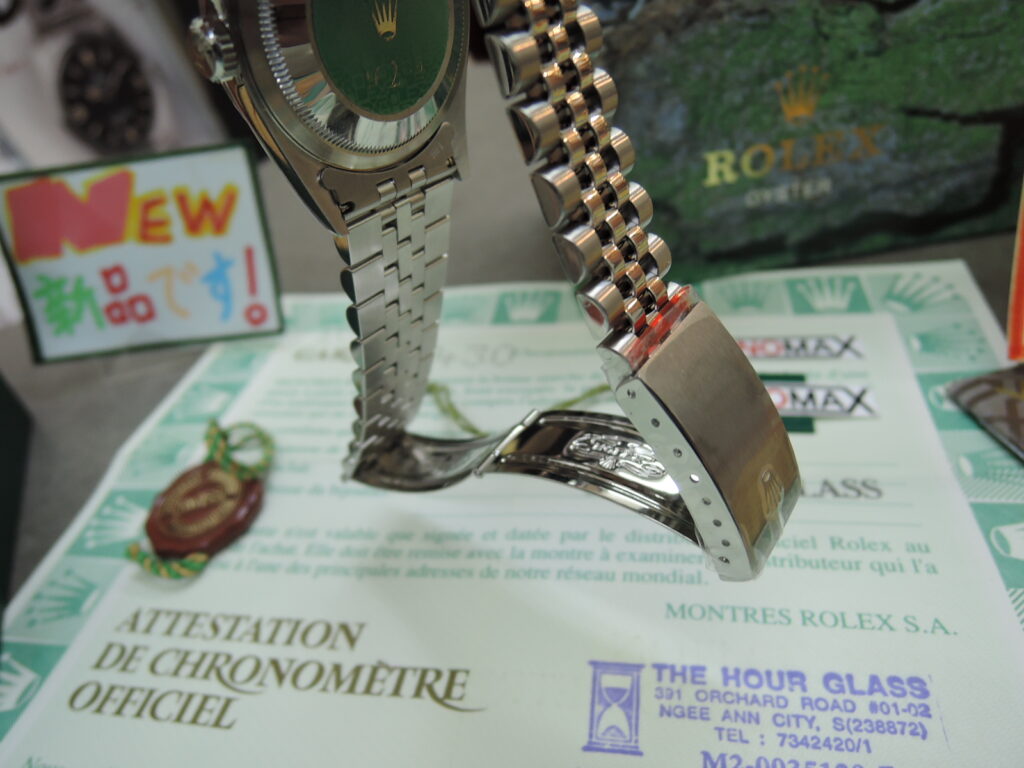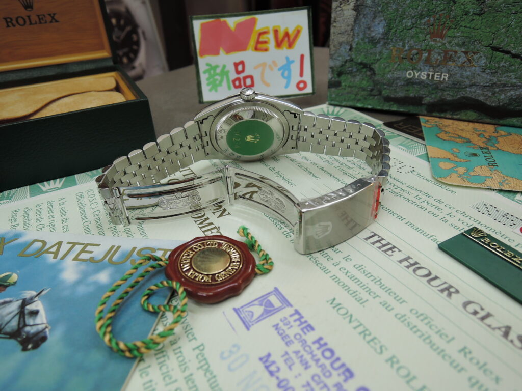 ✨・✨ NEW”未”使用・デットストック❕💗💛✨・ROLEX国番号430・シンガポール・世界🌎の名店からONOMAXへ✨『・DJ・36mm・Ref16234・✨生成りアイボリー色”彫りコンピューターアラビア”文字盤・Tトリチ・✨5連ジュビリーSシングルブレス(・W刻印・1995年製・フルコマ・赤保護シール付・ブレス”未”調整・)💗💛希少ポイント・裏蓋”Ref16234”緑色ホログラムシール付!✨・✨ NEW”未”使用・デットストック❕💗💛』✨1996年製の30年物✨これぞ”定番” DJ デイトジャスト”36mm”・実物を見て👀もらえば納得されますが・・ほぼ使用していません❕前オーナー談💗・正直・室内にて・何回か❓・腕に乗っけて眺めてました・(o^―^o)ニコ・でも・・やっぱり・・使えなかったんです❕💗✨💛新品 ”未使用”入荷!ONOMAX名物で登場!✨✨「あのーー”新品購入”後 ブレス”未”調整✨”使わなかった”んです!」シリーズ!✨✨やって参りました!今回は「経過年数”30年”物の”DJ ”です!」新品”未使用”モデル!✨・国番号430・シンガポール・世界🌎の名店経由✨・の・✨勿論ですが・”ワンオーナー&ノンポリッシュ”状態!✨・S品番 ~1996年製・✨・18KWGホワイトゴールド×SSステンレス製✨ 36mmケース ✨”大定番”の DJ デイトジャスト 希少今はもう存在しない希少な・✨生成りアイボリー色”彫りコンピューターアラビア”文字盤✨ 純正Tトリチウム夜光✨ ギザギザな豪華”18KWG無垢製”フルーテッドベゼル!✨サファイヤクリスタル風防 自動巻 100M防水 王冠竜頭✨ 今はもう”存在しない希少ポイント・裏蓋”Ref16234”緑ホログラムシール付!✨5連コンビジュビリーシングルブレス(・W刻印・1995年製・フルコマ・赤保護シール付・ブレス”未”調整・)✨ほぼ使用していないのでバックルの開閉が”重たい”のです!至れり尽くせり”奇跡”の保管状態!新品”未使用”&完品&奇跡の未使用・🏝南国シンガポール・世界🌎の名店・経由入荷❕💗💛