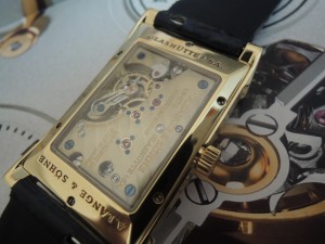 珍しいモデルが入りました。その名は「カバレット」ダンディーなモデルで御座います。このモデルの特徴は何と言っても「アウトサイズデイト」です。日付が実に見やすいのです。そしてゴージャス感漂う雰囲気と完璧なる配置の文字盤。時針・分針・スモールセコンド針は全て18KYG製で御座います。ケース裏を拝見して頂くと芸術品を見ているようで流石ランゲです。