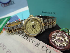 TOKYOで・・『✨”TIFFANYティファニー✨で最高な✨Wネーム✨ディナーを❣』✨✨✨✨✨間違いなく”本物”です(購入時レシート付き)❕💗『✨”ROLEX”&”TIFFANY&Co”Wネーム✨・❕❣』✨・・・SPスぺシャルプライスでいっちゃってーーーーーーーGO——————————❕💗・💛素敵なレデイーに如何ですか❓❕・な✨お久しぶり❣✨・『レデイース✨L品番・~1989年・Ref69173/18KYG×SSコンビ❣25mmケース💛』・・・・・USAアメリカ・より来日!!『✨・”完璧”・✨”TIFFANY&Co”Wネーム✨・を・プレゼンしMAX❕❣』・皆さーーーーーーーーーん!テイファニー”Wネーム” 誰もが疑わない ”本物” が 変態常連様から無事”買取”出来ました!!さあ”本物を”ずーーーーーと探している”あなた・大チャンス”の時が今❣えーーい!皆の者 控え 控え!この”TIFFANY&Co購入時レシート&保証書”が目に入らぬか!このモデルを何と心得る 「かつて一世を風靡した”200% 本物”なティファニー”Wネーム”様だぞ!」誰が何と言っても『本物です❣❕』・奇跡のティファニーレシート付き・DJデイトジャスト・Ref69173・コンビ・Wネーム到着!生産終了品 L品番・L8シリアル❕・ 1988年~1989年製 前オーナー綺麗に使っていただき感謝❣綺麗な状態です!!25mm・DJデイトジャスト!18KYG×SSステンレス製・コンビ・フルーテッドべゼル&希少な金シャンパンバータペストリー文字盤!!5連ジュビリーコンビブレス(21コマ・O刻印・~1990年)の組み合わせが素晴らしい!!前オーナー様が大切に使われていましたので”綺麗な”状態です!至れり尽くせり・USAアメリカコンプリート状態!付属品も・完璧完品・間違いなく”本物”なUSAアメリカ経由Wネームモデル入荷❕❣