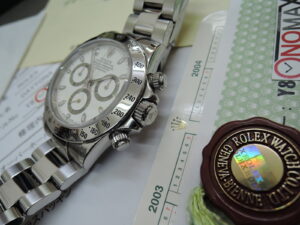 『ただいま”商談中”です』✨✨✨✨・・・・・今日みたいな燦燦と照り付ける🌞太陽さんの日差しでは❓・もっと(o^―^o)ニコ”焼け”ちゃうよ❕💛💗💛💗・・✨保証書無し✨・・Ref116520WH・・”初期”のみに許された❓❕・・”白”ホワイト・の・選ばれし”幸運”なモデルだけ・の・・イリュージョン!!今や・焼けてる?!と言ったらこれだ!!『Ref116520デイトナ・”アイボリー”ダイヤル!!』・”・2003年・Y品番・保証書無し”・・伝説となれ・CHANG–COLOR DIALS・IVORY・・・”Y品番”・・”保証書無し”・・・”焼けてます!”・・!えっ私・ONOMAX・ですか?!それも?そうですが・・・いや いや この”白色であったであろう・・デイトナ様”ですよ!”アイボリー”色に変化する・・極少数のデイトナ様・ ”Y品番”シリアル!白では無い ”アイボリー”様入荷ですよ!「さらに”タンニング”して”育て”ませんか?」タンニングかもーーーん!日焼け大好きMAX時代到来!冗談も程々に!誰も予想がつかない・・自然現象!”日焼け”今でも進行中!!”アイボリー色”は如何ですか?! 変態常連様から・・ 緊急入荷!!・感謝・感謝・感謝・です!! 皆様 大好きポイント・・これからも期待する”アイボリー色”!!”初”自社ムーブメント搭載”初期型”モデル・2003年製”y品番”!最後のSSステンレス製タキメーターべゼルモデル!デイトナ 白文字盤だった”アイボリー生成色”文字盤!3連オイスターハードWロック旧型ブレス(AD刻印・2003年・フルコマ状態) SSステンレス製 自動巻自社ムーブメントcal4130搭載 40mmケース 100M防水 当然・”バキバキ&キレキレ”状態!”アイボリー”な”美しい焼けアイボリー文字盤&・保証書無し・その代りご納得間違い無し・変態様保管モデル✨2009年🗾日本ROLEXサービスにてOHメンテ済み(サービス保証書付き)&2022年某修理工房にてOHメンテ済み(納品書付き)✨経由入荷❕💛💗💛💗・・ただいまONOMAXでは『1回払い~24回払いまで・無金利・ショッピングローンが絶好調!!”アイボリー”デイトナ様¥3,333,333・なら・無金利・頭金無し・24回払いで月々・¥138,800・で買えちゃいMAX!!』