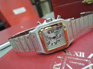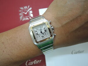 💛💗・・・・本日・ONOMAX大好き✨CARTIER様✨を持ってって❕💛💗・・・(o^―^o)ニコ・・・”この✨価格✨なら買える❕”・・💛永久カレンダー&クロノグラフ💗モデル・を・みーつーけーた❕💛💗”・・✨✨『・付属品・保証書無し・&・CARTIERBOX付き✨18KYGイエローゴールド&SSステンレス製コンビケース&ブレス✨Qzクオーツ・🔋電池式・メンズ・42mm×29mm・クロノグラフ・』✨✨・・・・その名も・✨✨サントスガルべクロノリフレックス・永久デイト表記・クロノグラフ・白ホワイト色・ローマ文字盤✨日常生活防水✨コンビベルト(美品状態)&観音開きバックル付き❕✨ピカピカ✨💛✨✨・サントスガルべクロノリフレックス・様・入荷❕💛💗