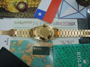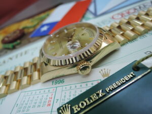 ✨✨付属品✨✨✨生産終了品 ✨18KYG無垢製✨ 当時のROLEX純正豪華純正大型BOX(内・革製王冠バックル付・外・)&保証書(紙製・パンチ抜き・国番号781・南米・チリ・首都サンチャゴ・)✨前期W品番(1995年~1996年)✨30年物✨2014年🗾日本ROLEXサービスにてOHメンテ済み(サービス保証書付き)&当店にてOHメンテ済み❕✨眩しい輝き✨ギザギザフルーテッド金べゼル❣・✨金色シャンパン・A💎ダイヤ文字盤✨Tトリチウム夜光✨❕✨ 日付デイト&曜日表記 ✨👑王冠竜頭✨ 自動巻 36mm 100M防水 ✨サファイヤクリスタル風防(👑王冠透かし無し)❕✨ほぼ伸びて無しPrプレジデントブレス(・22コマ・V刻印・~1996年製)💛 ✨当時の小冊子×1冊(YOUR ROLEX)❣❕✨当時の緑色オリジナルシリアルNoナンバー入り緑タグ&赤タグ付き❣💛・ROLEXカレンダーカード(1996・1997)❕✨ノンポリ❓みたいに✨✨バキバキ&キレキレ状態・完品&美品✨金✨💎ダイヤ”モデル・・南米・チリ・首都サンチャゴ・経由入荷❕❣