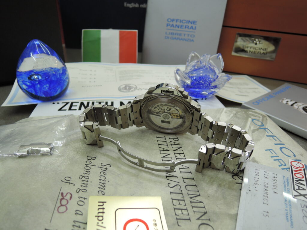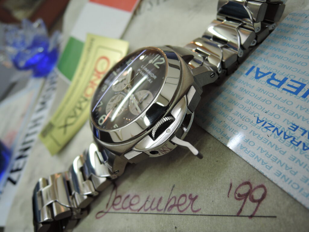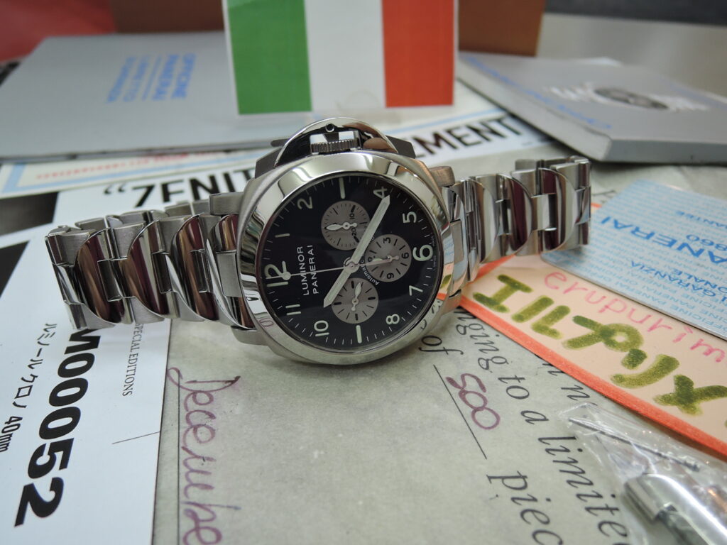 ボンジョルノ~陽気なイタリアから✨✨PANERAI ファースト”1st”クロノ💗🌎世界限定500本💛入荷しました❕💗💛✨✨しかも中身は❓あのゼニス社の”エルプリ”様ムーブメント搭載なんです❕💗💛✨✨「へー最初ってべゼルって・”刻みが無い”・ピカ✨ピカ✨表面な✨刻み無しポリッシュべゼル ✨なんだぁ~❕💗💛」✨✨B品番 1999年製 ・PANERAIの・本場イタリア経由・大人気・完品美品・モデル❕💗💛💗💛✨✨希少500本限定!✨✨40mmケース チタンTi×ステンレスSSコンビ✨✨ PANERAI史上1stファースト”クロノ”グラフモデル!✨✨ルミノールクロノ ✨✨刻み無しポリッシュべゼル ✨✨自動巻名機”エルプリメロ初搭載”モデル ✨✨裏スケルトン✨✨ 観音開きバックルコンビ純正ブレス(内径MAX19.5cm位) ✨✨ルミノバ夜光 ✨✨200M防水✨✨ 当店にてOHメンテナンス済!✨✨希少40mmクロノモデル入荷❕💗💛