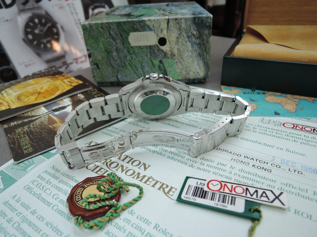 ✨✨付属品✨✨・綺麗なUSED・『オンリーSWISSスイス』(ルミノバ夜光)表記・✨ 生産終了品 ✨28年物✨当時の純正ROLEX BOX(・内・外・Ref16570●シール付き)💗💛保証書(・紙製・パンチ抜き・HONG KONG 香港・U品番✨U9シリアル✨1998年12月2日)✨✨U品番1998年製 40mmケース✨・”経年変化なし・✨美肌✨”黒色文字盤 生産終了品 Ssステンレス製 自動巻 100M防水✨✨ ROLEX純正Ref16570裏蓋王冠シール付✨✨ ・伸び無し・3連オイスターハードフルコマWロックブレス(ブレス”フルコマ”・U刻印1998年製) ✨✨当時のタグ(赤・緑シリアル入り)保証書ケース(緑革製・小)✨✨小冊子×2冊(エクスプローラー・YOUR ROLEX) 極上USED&完品・香港経由入荷!