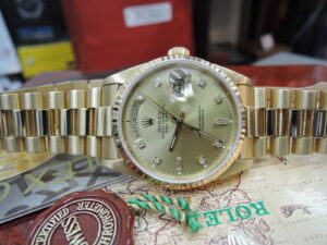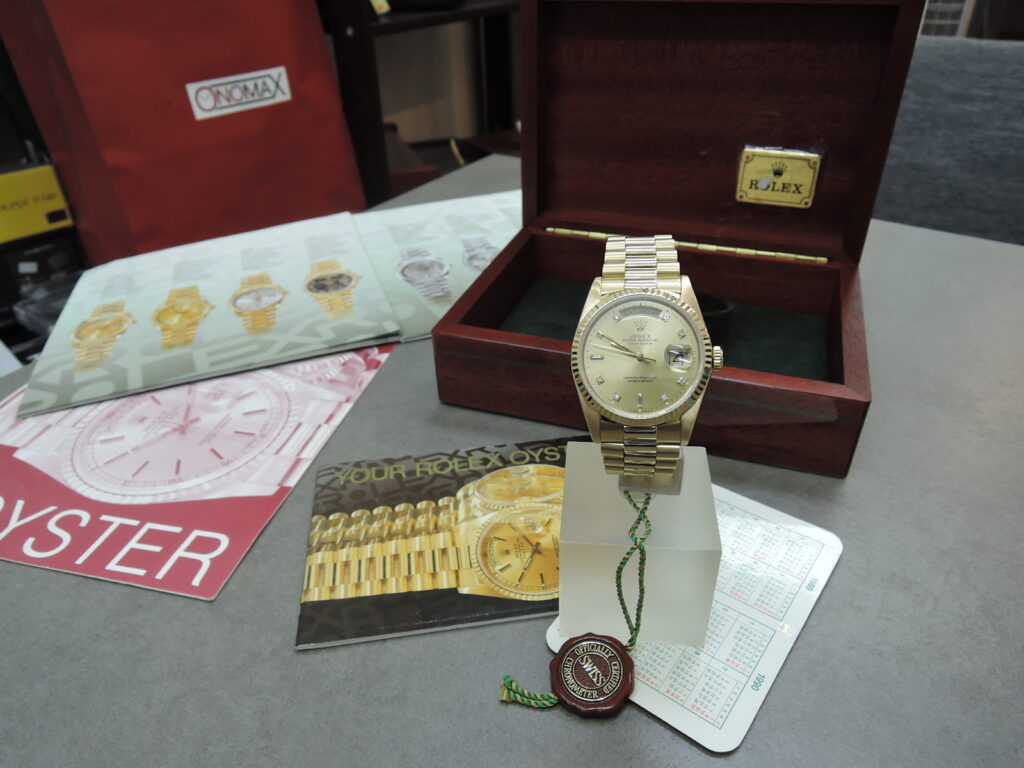 ( ^ω^)✨✨本日の ONOMAXおすすめモデル❕✨✨💛インスタグラム📷にもUPしてMAX❕💛💗✨✨Ref18238A💎ダイヤ『初期”L”品番』・✨L3シリアル✨・1989年~1990年製✨✨保証書無し✨✨で・す・が❕💗現行6桁モデルよりも✨今ならまだ💗安く購入可💛いま💛大人気❕💛・36mm・5桁デイデイト💗の・・(o^―^o)ニコ・・バキバキ・・💗金色●🍾シャンパン・A💎ダイヤ・💗ONOMAXに参上❕💛💗GO——-———-———❕💛💗眩しい輝き💗✨金✨金✨金✨金✨金✨金✨金✨金✨”金”無垢MAX!✨Prプレジデントブレス💛✨『💗この🌸春🌸に💗王道のデイデイト✨A💎ダイヤ✨&✨”金●”文字盤・Tトリチ✨初期L品番・Ref18238A💎✨💛💗』✨・・・・💛✨✨🌸春爛漫が🌼すぐそこ❕💛💗✨東京は気温上昇🌞・HOTな日・に・ONOMAXに・・とても✨”ゴールデン”HOT✨な🌸金ゴールド無垢✨🌸DAY DATE様✨が✨お得な¥プライスで行きMAX❕GO——————-———-———–———————-———–——-❕💗‥豪華❣・36mm・💗✨・Ref18238A・最高峰✨「デイデイト」様✨初期L品番・1989年~1990年製・Prプレジデントブレス(22コマ・N刻印・1989年製)💛💗💛💗ありがとう❣✨変態様経由❣・✨当時の赤タグ付き❣💛💗💛💗・”保証書無し”❕❣・・・魅惑の✨”DAY–DATE”様✨入りました❕💛💗💛💗”一目ぼれ”間違い無し❕❣・・生産終了品 初期型”L”品番✨1989年~1990年製!✨18KYG無垢製✨ ROLEXブランド最高峰『デイデイト』💛💗💛💗36mmケース 誰もが”一度”は手にしたい!!デイデイト ”・✨金色●🍾シャンパン💎A💎ダイヤ✨文字盤&Tトリチウム夜光❕❕✨ 100M防水 自動巻! ✨サファイヤクリスタル風防(👑王冠透かし無し)❕ ギザギザ・フルーテッドべゼル!✨👑王冠竜頭✨❕❕当時の豪華木製ROLEX純正BOX(内のみ)!程度もご安心ください・当然の”バキバキ&キレキレ”なんですから!✨✨美品✨✨変態様❣経由入荷❕❣
