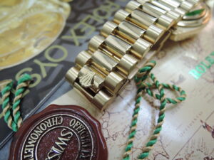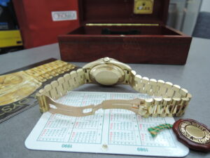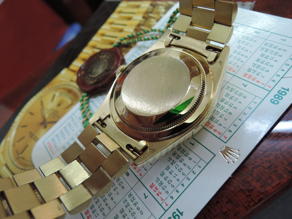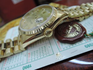 ✨✨付属品✨✨生産終了品 ✨18KYG無垢製✨ 保証書無し✨当時の豪華純正大型BOX(内のみ・木製)✨初期L品番・L3シリアル・(1989年~1990年)✨当店にてOHメンテ済み💗💛❕フルーテッドべゼル❣・✨●金色シャンパン・A💎ダイヤ文字盤✨Tトリチウム夜光✨❕✨ 日付デイト&曜日表記 ✨王冠👑マーク竜頭✨ 自動巻 36mm 100M防水 ✨王冠👑マーク無しサファイヤクリスタル風防✨Prプレジデントブレス(22コマ・N刻印・1989年製)💛💗 ✨小冊子×1冊(YOUR ROLEX)❣❕✨当時の赤タグ付き❣💛・ROLEXカレンダーカード(1989・1990)❕✨バキバキ&キレキレ状態&美品✨金✨💎ダイヤ”モデル・変態様経由入荷❕❣